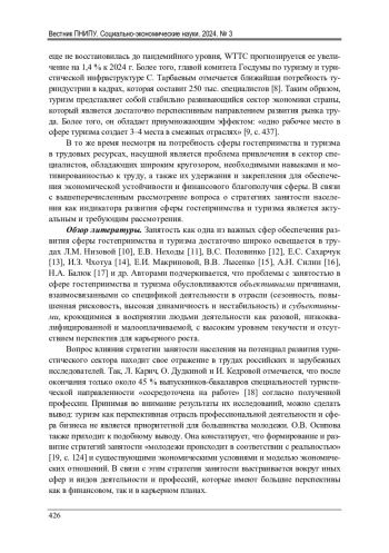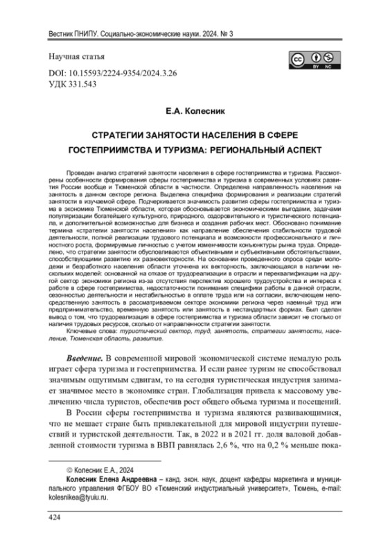 Проведен анализ стратегий занятости населения в сфере гостеприимства и туризма. Рассмотрены особенности формирования сферы гостеприимства и туризма в современных условиях развития России вообще и Тюменской области в частности. Определена направленность населения на занятость в данном секторе региона. Выделена специфика формирования и реализации стратегий занятости в изучаемой сфере. Подчеркивается значимость развития сферы гостеприимства и туризма в экономике Тюменской области, которая обосновывается экономическими выгодами, задачами популяризации богатейшего культурного, природного, оздоровительного и туристического потенциала, и дополнительной возможностью для бизнеса и создания рабочих мест. Обосновано понимание термина «стратегии занятости населения» как направление обеспечения стабильности трудовой деятельности, полной реализации трудового потенциала и возможности профессионального и личностного роста, формируемые личностью с учетом изменчивости конъюнктуры рынка труда. Определено, что стратегии занятости обусловливаются объективными и субъективными обстоятельствами, способствующими развитию их разновекторности. На основании проведенного опроса среди молодежи и безработного населения области уточнена их векторность, заключающаяся в наличии нескольких моделей: основанной на отказе от трудореализации в отрасли и переквалификации на другой сектор экономики региона из-за отсутствия перспектив хорошего трудоустройства и интереса к работе в сфере гостеприимства, недостаточности понимания специфики работы в данной отрасли, сезонностью деятельности и нестабильностью в оплате труда или на согласии, включающем непосредственную занятость в рассматриваемом секторе экономики региона через наемный труд или предпринимательство, временную занятость или занятость в нестандартных формах. Был сделан вывод о том, что трудореализация в сфере гостеприимства и туризма области зависит не столько от наличия трудовых ресурсов, сколько от направленности стратегии занятости.