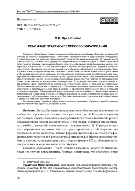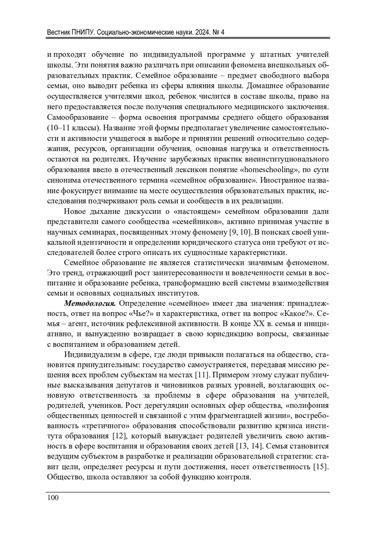 Семейное образование сравнительно новый феномен в российском обществе, вызывающий интерес со стороны общественности, чиновников, исследователей и родительского сообщества. В последние годы эта практика стала видимой: увеличилось количество семей, обучающих детей самостоятельно, эта тема стала предметом дискуссий на политической арене, в СМИ и социальных сетях. Многие практики, к которым прибегают родители, обучающие детей без помощи школы, подвергаются критике из-за того, что они реализуются за счет сторонних ресурсов. Родители нанимают репетиторов, объединяются в группы совместного обучения, обращаются к онлайн-школам. Законодатели и контролирующие органы заявляют о необходимости более точно описать роль семьи в обучающей деятельности, например, для определения ответственности за соблюдение прав несовершеннолетних и качество образования детей, обучающихся в семье. Сами «семейники» в поисках своей уникальной идентичности и определении юридического статуса требуют от исследователей более строго описать их сущностные характеристики. В статье рассмотрены практики семейного образования, дана характеристика проявления субъектности семьи в процессе их реализации. Определяющими критериями «семейности» образования выделены принадлежность семье, как управление и реализация за счет своих ресурсов, и проявление особенностей семьи в процессе и конечном продукте. Объединяющей характеристикой практик семейного образования является формирование и поддержка учебной мотивации, определение целей, построение и реализация индивидуального образовательного маршрута. Эти действия позволяют семье присвоить образование и отразить в нем свои ценности и интересы.
