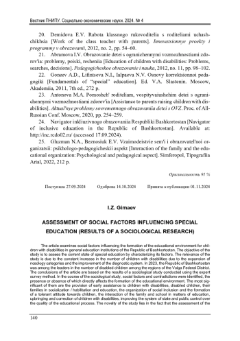 1. Гимаев, И.З. Система образования детей с ограниченными возможностями здоровья как объект научного исследования / И.З. Гимаев // Society and Security Insights. - 2024. - Т. 7, № 2. - С. 156-168. EDN: CHMGUD