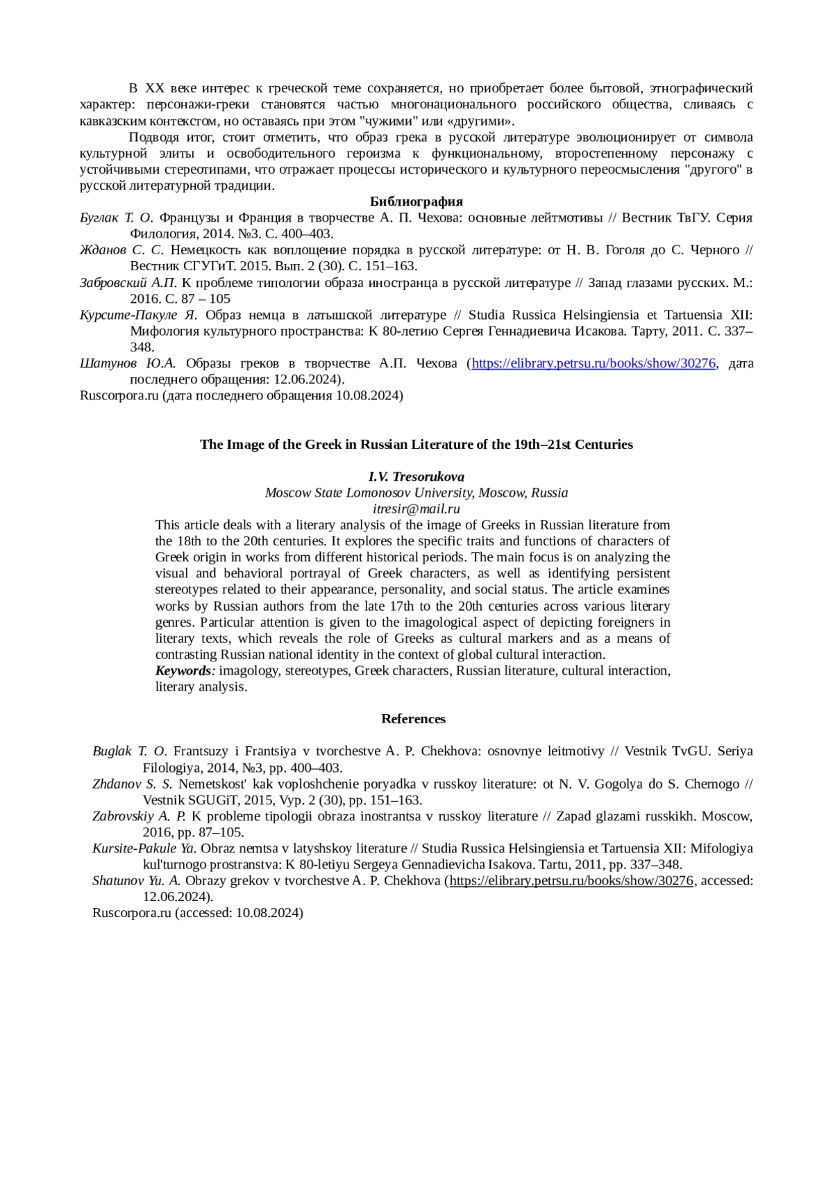 В статье проводится литературоведческий анализ образа греков в русской литературе с XVIII до XX века. Исследуются специфические черты и функции персонажей греческого происхождения в произведениях разных эпох. Основное внимание уделено анализу визуального и поведенческого портрета греческого персонажа, а также выявлению устойчивых стереотипов, связанных с их внешностью, характером и социальным статусом. Рассматриваются произведения русских писателей конца XVII – ХХ вв различной жанровой принадлежности. Особое внимание уделено имагологическому аспекту изображения иностранцев в литературном тексте, который позволяет выявить роль греков как культурного маркера и средства противопоставления русской самобытности в условиях глобального культурного взаимодействия.
