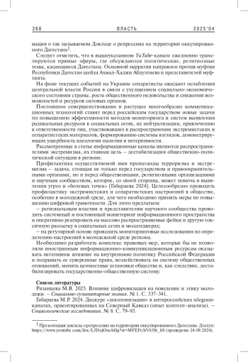 2. Габараева М.Р. 2024. Дискурс “деколонизации” в антироссийских telegram-каналах, ориентированных на Северный Кавказ (опыт контент-анализа). - Социологические исследования. № 8. С. 79-93. EDN: DKKBXS