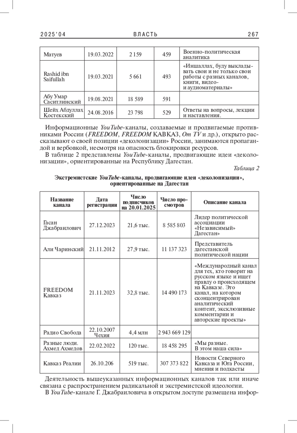 В статье автор анализирует ряд информационных каналов таких сервисов, как Telegram и YouTube, ориентированных на Республику Дагестан, деятельность которых направлена на разжигание межнациональной и межконфессиональной розни, сепаратистских и националистических настроений. Целью таких информационных каналов является формирование негативного образа России и образа колонизированных народов Дагестана.