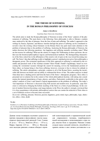 Цель данной статьи - рассмотреть учение римских стоиков с точки зрения их анализа феномена страдания. В процессе исследования раскрывается главный тезис: философия стоиков способна освободить современного человека, порабощенного идеей наслаждения, от страха перед опытом боли и страдания. Считаем подход к текстам Сенеки, Эпиктета и Марка Аврелия через призму страдания новаторским, т. к. в критической литературе, исследующей наследие стоиков, гораздо больше внимания уделялось проблеме удовольствия, нежели страдания. В процессе анализа стоической философии разбираются следующие вопросы: являются ли счастье и страдание взаимоисключающими состояниями? Каковы причины страдания? В чем состоят критерии счастливой жизни? При раскрытии указанных выше вопросов используются историко-философский, герменевтический и логический методы. Особенность стоической школы заключается в утверждении созидательной роли боли на пути к становлению самим собой. Идея стоиков о способности страдания высветить духовную силу человека сообщает стоической концепции терапевтическую силу. Экзистенциальная значимость стоического подхода к страданиям подтверждается научно-практической деятельностью австрийского ученого Виктора Франкла. Логотерапия Франкла, основанная на преодолении «экзистенциального вакуума» через поиск смысла, возрождает фундаментальное положение стоической этики: ни один человек не свободен от страданий, однако каждый свободен в выборе своей установки по отношению к страданию. В статье обосновывается общий для всех римских стоиков принцип, утверждающий неразрывную связь между нашими убеждениями и способностью выдерживать удары судьбы. Автор подробно разбирает, какие именно представления обладают целительной силой и составляют основу «терапевтической программы» стоиков. Этика стоиков раскрывается автором статьи не изолированно, но в контексте целостного философского учения, с учетом внутренних взаимосвязей логики, физики и этики. Особую ценность работе придает авторский анализ логической аргументации Зенона и Сенеки, посвященной теме страдания. Проблема актуальности стоицизма в современности обсуждается автором с привлечением как античных, так и современных текстов. В частности, осуществляется критика «поп-стоицизма», сводящего целостное учение стоиков к разновидности психотерапии. В условиях превращения современного стоицизма в настоящую мега-индустрию на Западе, считаем, что именно обращение к философским первоисточникам способно противостоять редукции идей стоиков к набору жизненных советов о том, как стать успешнее.