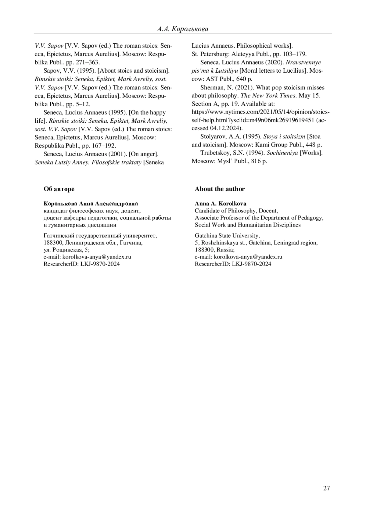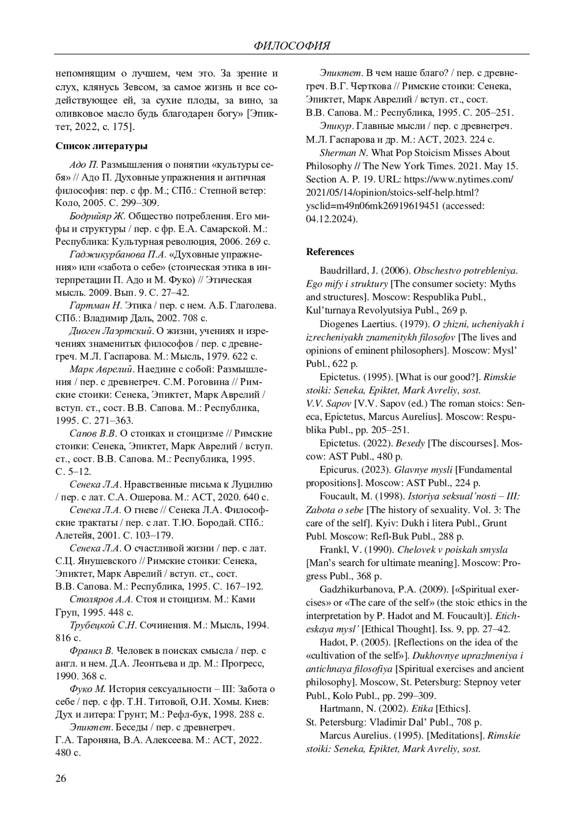 18. Sherman N. What Pop Stoicism Misses About Philosophy // The New York Times. 2021. May 15. Section A. P. 19. URL: https://www.nytimes.com/2021/05/14/opinion/stoics-self-help.html?ysclid=m49n06mk26919619451 (accessed: 04.12.2024).
