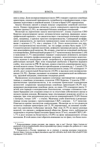В статье рассматриваются трансформации семейных ценностей и репродуктивных установок среди студентов среднего профессионального образования (СПО) Республики Бурятия под влиянием современных глобальных процессов. На основе исследования выявлены ключевые тенденции: увеличение возраста вступления в брак (48,3% планируют вступать в брак в 25-34 года), рост приоритета карьеры (16,9%) и материального благополучия (9%), особенно среди девушек. Авторы анализируют предпочитаемые модели семьи, желаемое число детей и факторы формирования ценностных ориентаций.