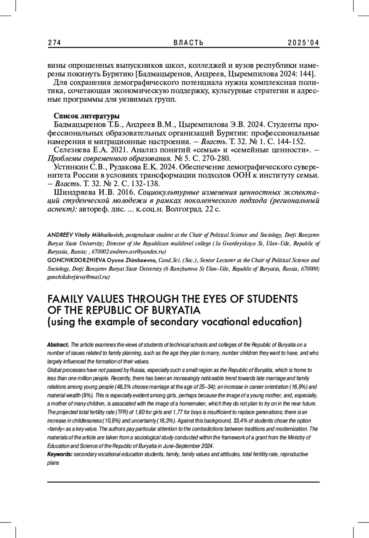 1. Бадмацыренов Т.Б., Андреев В.М., Цыремпилова Э.В. 2024. Студенты профессиональных образовательных организаций Бурятии: профессиональные намерения и миграционные настроения. - Власть. Т. 32. № 1. С. 144-152. EDN: DAJSHM