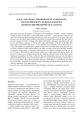Статья посвящена проблеме подлинности и неподлинности человеческого существования, рассмотренной через призму философии Другого Э. Левинаса в терминах лица и маски соответственно. Данный «этико-феноменологический ракурс» открывает новые перспективы в исследовании указанной проблемы и преодолевает этический субъектоцентризм, характерный для экзистенциализма в целом. Рассматриваются основные концепты онтологии субъекта Э. Левинаса - Самотождественность, онтологическая уязвимость субъекта, его «стихийный солипсизм», а также такой «глубокий феномен», как лик Другого. Этот феномен раскрывается в четырех ипостасях: 1) как выражение; 2) как абсолют; 3) как лик этический; 4) как след Бесконечного. В этой связи утверждается, что для подлинного существования нет ни масок со стороны субъекта (как в отношении его самого, так и в отношении Другого), ни масок со стороны Другого. Неподлинное существование, наоборот, связано с наличием маски как следствия самого способа бытия Самотождественного субъекта (с его «безвременностью», «телесностью» и «поглощением»): ее наличие выступает иллюзией, продиктованной «властным солипсическим рефлексом» субъекта и его онтологической уязвимостью к Другому. В таком случае маска (неподлинность) оказывается отношением субъекта к себе, миру и Другому, которое преодолевается только в разрыве Тотальности собственного сознания и этической встрече с ликом Другого. Делается вывод, что подлинность Другого, обнаруживаемая субъектом в его лике и этическом отношении к нему, определяет подлинность самого субъекта.