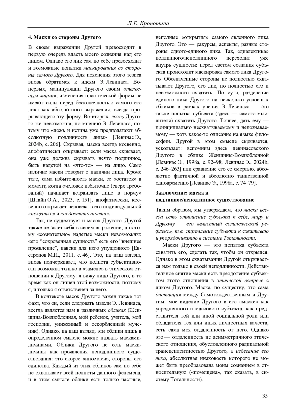 4. Евстропов М.Н. Теория субъективности Эмманюэля Левинаса: между онтологией и этикой // Мысль: Журнал Петербургского философского общества. 2013. № 15. C. 57-70. EDN: SMFMEX