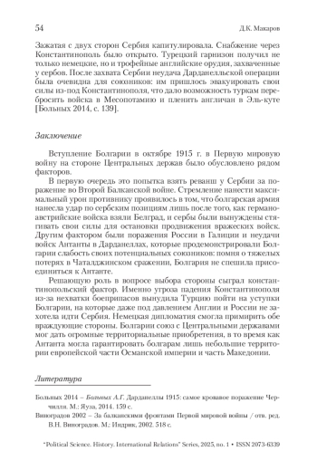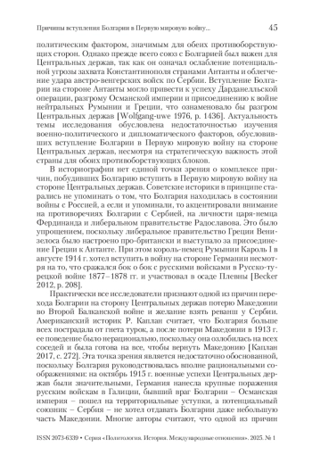 МАКАРОВ Д. К. ПРИЧИНЫ ВСТУПЛЕНИЯ БОЛГАРИИ В ПЕРВУЮ МИРОВУЮ ВОЙНУ НА СТОРОНЕ ЦЕНТРАЛЬНЫХ ДЕРЖАВ: ВОЕННО-ПОЛИТИЧЕСКИЙ И ДИПЛОМАТИЧЕСКИЙ АСПЕКТЫ // ВЕСТНИК РГГУ. СЕРИЯ: ПОЛИТОЛОГИЯ. ИСТОРИЯ. МЕЖДУНАРОДНЫЕ ОТНОШЕНИЯ. 2025. № 1