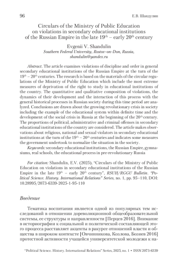 Статья посвящена изучению нарушений дисциплины и порядка в общеобразовательных средних учебных заведениях Российской империи на рубеже XIX–XX вв. В основе лежит изучение материалов циркулярных предписаний Министерства Народного просвещения с применением самых крайних мер лишения права на обучение в образовательных учреждениях страны. Проанализированы количественный и качественный состав нарушений, их динамика развития и взаимосвязь этого процесса с общеисторическими процессами в российском обществе в указанный период. Сделаны выводы о нарастании революционного кризиса в обществе на примере образовательной системы в определенных временных рамках, иллюстрирующих развитие социального кризиса в России в начале ХХ в. Рассмотрены пропорции политических, административных и уголовных преступлений в средних образовательных учреждениях страны. В статье сделаны наблюдения о религиозном, национальном и половом составе нарушителей в средних учебных заведениях на рубеже веков и указаны некоторые меры правительства по нормализации ситуации в обществе.