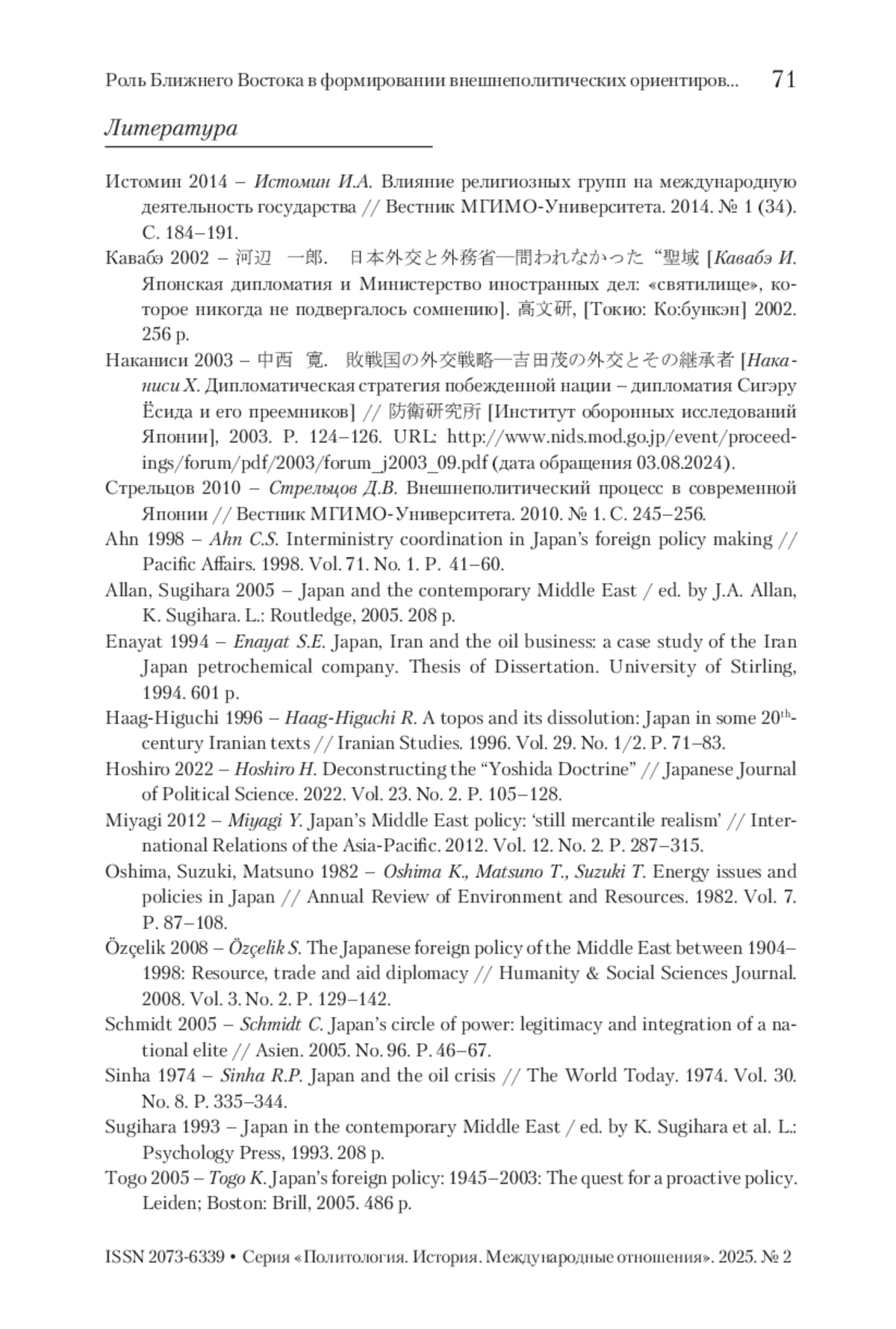 10. Miyagi 2012 - Miyagi Y. Japan’s Middle East policy: ‘still mercantile realism’ // International Relations of the Asia-Pacific. 2012. Vol. 12. No. 2. P. 287-315.