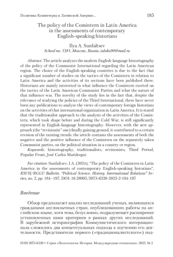 СУЗДАЛЬЦЕВ И. А. ПОЛИТИКА КОМИНТЕРНА В ЛАТИНСКОЙ АМЕРИКЕ В ОЦЕНКАХ СОВРЕМЕННЫХ АНГЛОЯЗЫЧНЫХ ИСТОРИКОВ // ВЕСТНИК РГГУ. СЕРИЯ: ПОЛИТОЛОГИЯ. ИСТОРИЯ. МЕЖДУНАРОДНЫЕ ОТНОШЕНИЯ. 2025. № 2