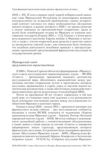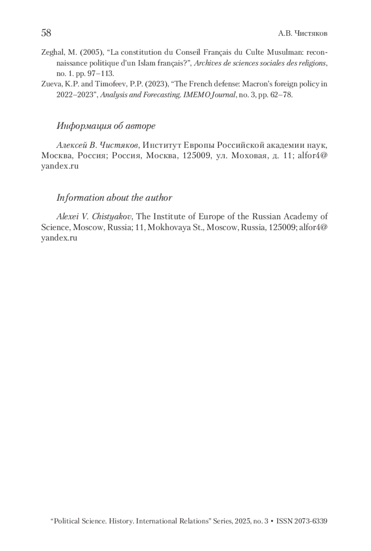 2. Гордон 2024 - Гордон А.В. Идеология интеграции мусульманского сообщества от Н. Саркози к Э. Макрону // Актуальные проблемы Европы. 2024. № 3. С. 101-122.