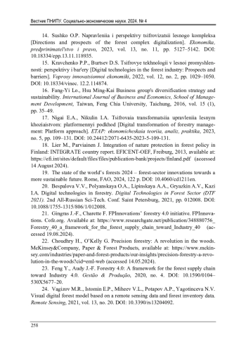14. Сушко, О.П. Направления и перспективы цифровизации лесного комплекса / О.П. Сушко // Экономика, предпринимательство и право. - 2023. - Т. 13, № 11. - С. 5127-5142. DOI: 10.18334/epp.13.11.118935 EDN: FLPZZR