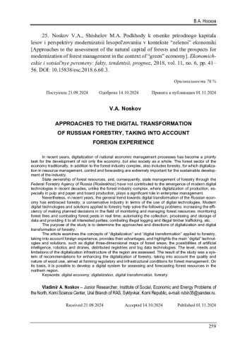 25. Носков, В.А. Подходы к оценке природного капитала лесов и перспективы модернизации лесопользования в контексте “зеленой” экономики / В.А. Носков, М.А. Шишелов // Экономические и социальные перемены: факты, тенденции, прогноз. - 2018. - Т. 11, № 6. - С. 41-56. DOI: 10.15838/esc.2018.6.60.3 EDN: YSQERN