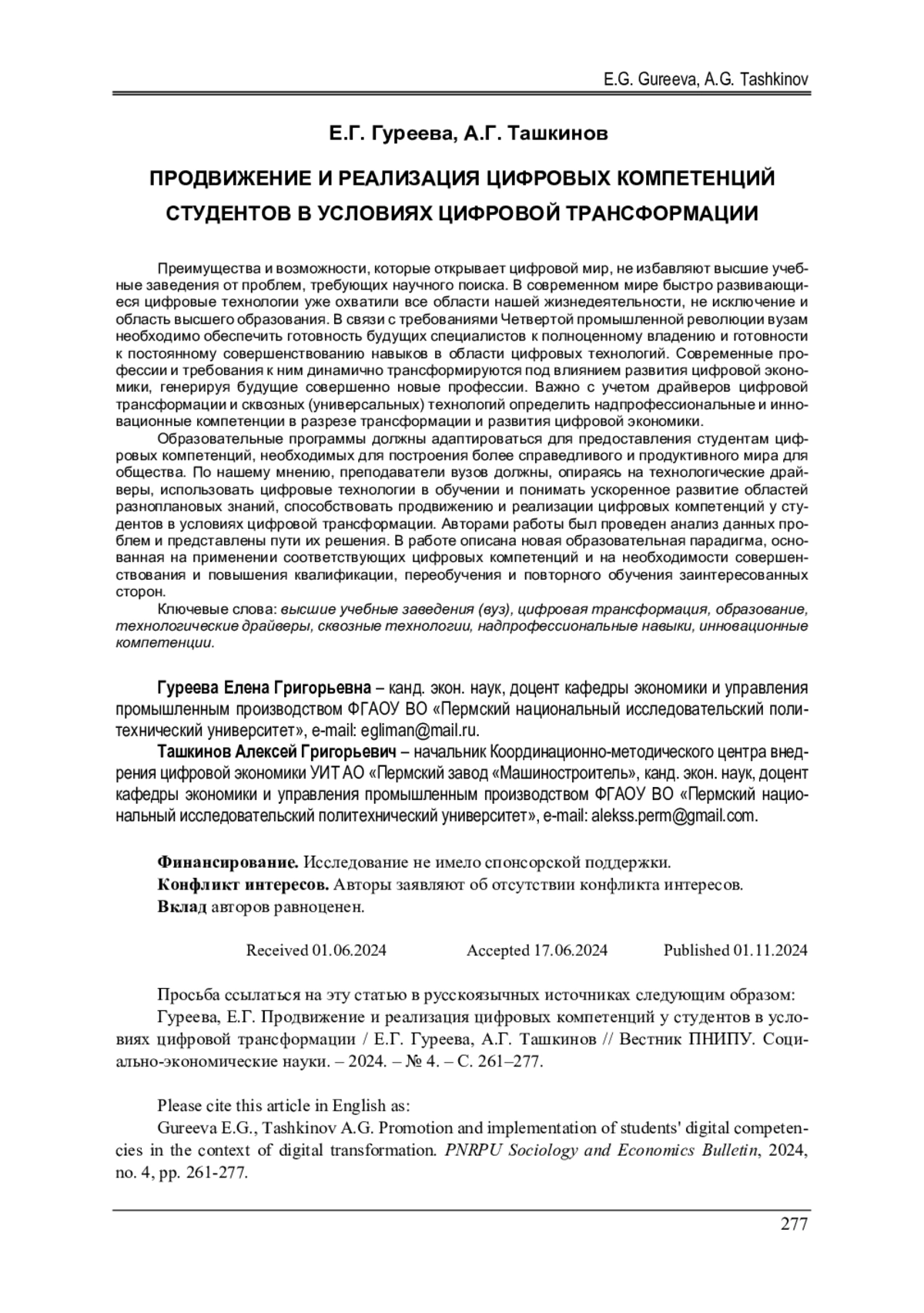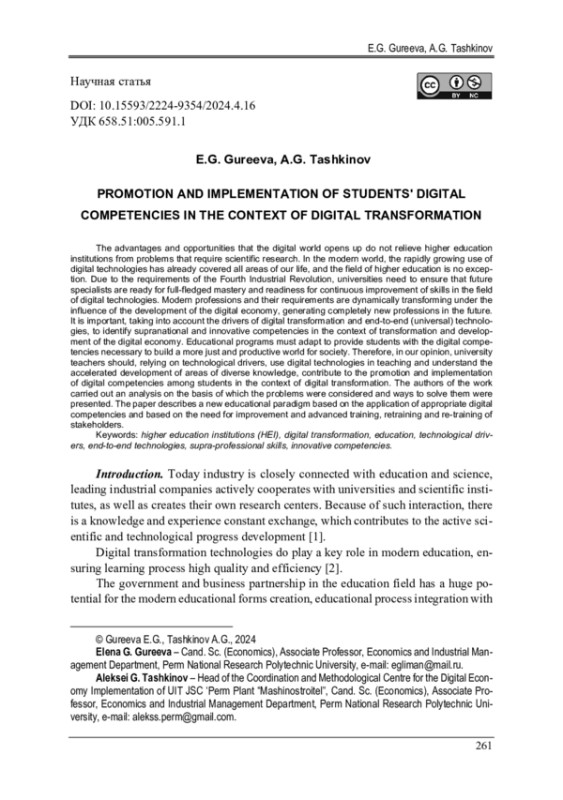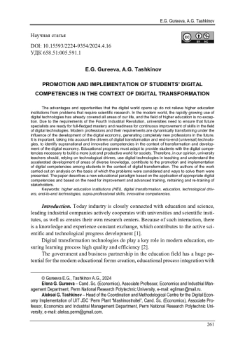 Преимущества и возможности, которые открывает цифровой мир, не избавляют высшие учебные заведения от проблем, требующих научного поиска. В современном мире быстро развивающиеся цифровые технологии уже охватили все области нашей жизнедеятельности, не исключение и область высшего образования. В связи с требованиями Четвертой промышленной революции вузам необходимо обеспечить готовность будущих специалистов к полноценному владению и готовности к постоянному совершенствованию навыков в области цифровых технологий. Современные профессии и требования к ним динамично трансформируются под влиянием развития цифровой экономики, генерируя будущие совершенно новые профессии. Важно с учетом драйверов цифровой трансформации и сквозных (универсальных) технологий определить надпрофессиональные и инновационные компетенции в разрезе трансформации и развития цифровой экономики. Образовательные программы должны адаптироваться для предоставления студентам цифровых компетенций, необходимых для построения более справедливого и продуктивного мира для общества. По нашему мнению, преподаватели вузов должны, опираясь на технологические драйверы, использовать цифровые технологии в обучении и понимать ускоренное развитие областей разноплановых знаний, способствовать продвижению и реализации цифровых компетенций у студентов в условиях цифровой трансформации. Авторами работы был проведен анализ данных проблем и представлены пути их решения. В работе описана новая образовательная парадигма, основанная на применении соответствующих цифровых компетенций и на необходимости совершенствования и повышения квалификации, переобучения и повторного обучения заинтересованных сторон.