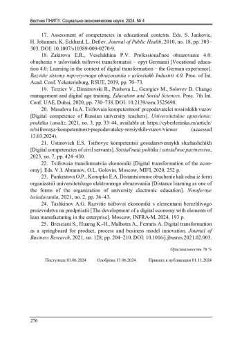 18. Zakirova E.R., Veselukhina P.V. Professional’noe obrazovanie 4.0: obuchenie v usloviiakh tsifrovoi transformatsii - opyt Germanii [Vocational education 4.0: Learning in the context of digital transformation - the German experience]. Razvitie sistemy nepreryvnogo obrazovaniia v usloviiakh Industrii 4.0. Proc. of Int. Acad. Conf. Yekaterinburg, RSUE, 2019, pp. 70-73.