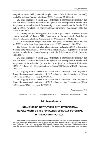 Статья: ВЛИЯНИЕ ИНСТИТУТОВ ТЕРРИТОРИАЛЬНОГО РАЗВИТИЯ НА ФОРМИРОВАНИЕ ЧЕЛОВЕЧЕСКОГО ПОТЕНЦИАЛА ДАЛЬНЕГО ВОСТОКА (2024)
