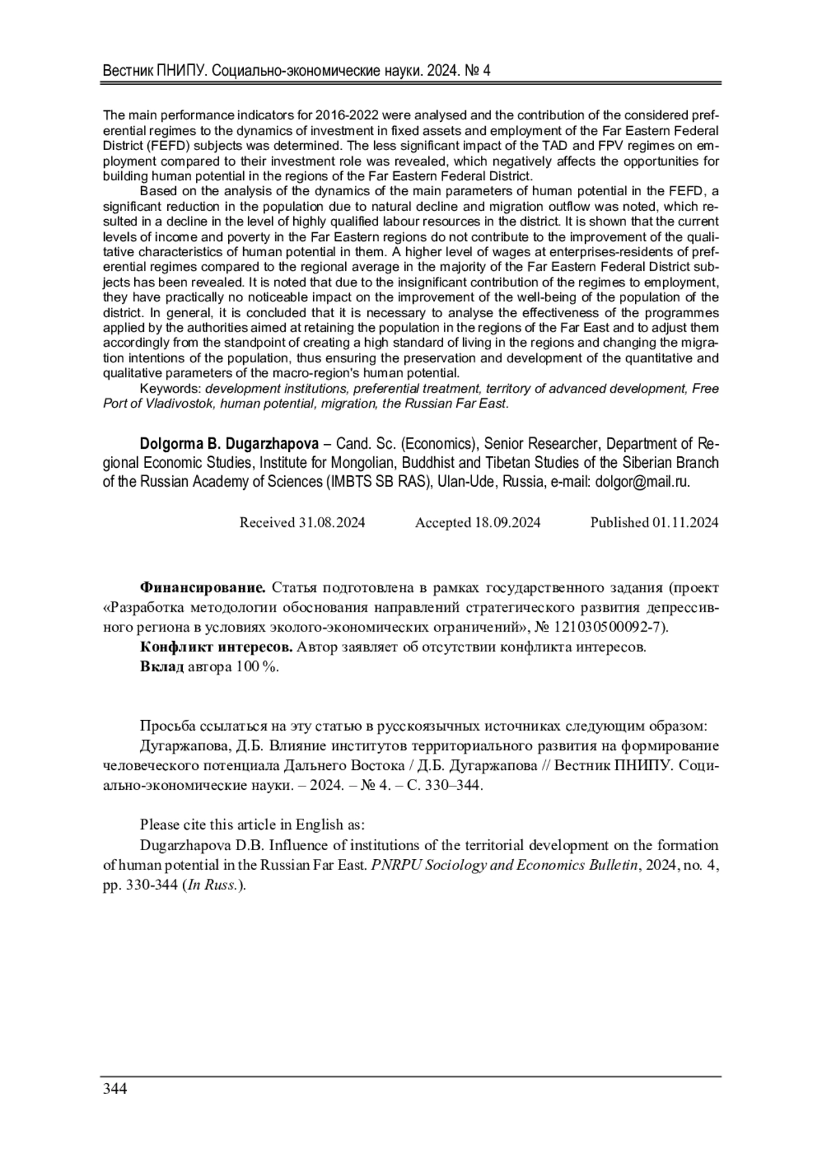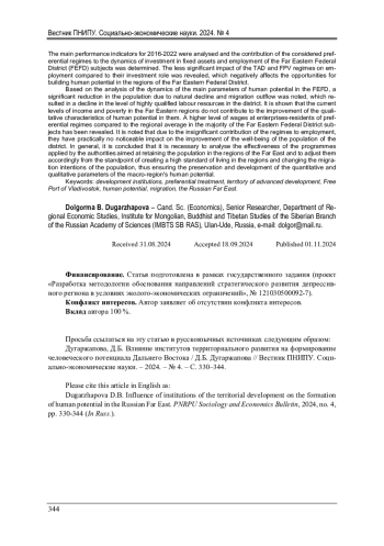 ДУГАРЖАПОВА Д. Б. ВЛИЯНИЕ ИНСТИТУТОВ ТЕРРИТОРИАЛЬНОГО РАЗВИТИЯ НА ФОРМИРОВАНИЕ ЧЕЛОВЕЧЕСКОГО ПОТЕНЦИАЛА ДАЛЬНЕГО ВОСТОКА // ВЕСТНИК ПЕРМСКОГО НАЦИОНАЛЬНОГО ИССЛЕДОВАТЕЛЬСКОГО ПОЛИТЕХНИЧЕСКОГО УНИВЕРСИТЕТА. СОЦИАЛЬНО-ЭКОНОМИЧЕСКИЕ НАУКИ. 2024. № 4