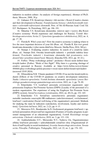 Ключевые фразы: ЛОЯЛЬНОСТЬ ПЕРСОНАЛА, КРЕАТИВНЫЕ ИНДУСТРИИ, КРЕАТИВНЫЙ КЛАСС, креативный город, ТВОРЧЕСКИЕ ИНДУСТРИИ, творческий класс