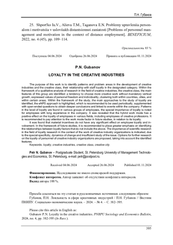 Рассмотрены закономерности и проблемные зоны в развитии креативных индустрий и креативного класса, их взаимосвязи с лояльностью персонала в обозначенной категории. В рамках качественного анализа исследований в области креативных индустрий, креативного класса, обозначены основные особенности данной группы: склонность к выбору более творческой работы без обязательного вертикального роста, выраженные ценности личной свободы и индивидуальности, кластеризация как в рамках стран, городов, так и в рамках определенных районов. В рамках исследования обозначены основные подходы к изучению лояльности, выделен подход eNPS, который рекомендовано применять с периодичностью, дополняя открытыми вопросами для получения более глубоких выводов и привязкой к событиям внутри компании. Обнаружены закономерности в уровне лояльности у различных групп сотрудников, обозначена особенная важность лояльности у сотрудников с большим стажем работы в компании. Выявлено, что гибридный режим работы позитивно влияет на лояльность сотрудников различных направлений, включая сотрудников креативных профессий. Рекомендовано в будущих исследованиях обратить внимание на фактор режима работы при взаимосвязи его с лояльностью. Установлено, что материальные стимулы не оказывают сколько-либо значимого результата на лояльность и вовлеченность сотрудников. В рамках будущих исследований рекомендуется сделать больший упор на выявление взаимосвязей между факторами лояльности, которые не включают вышеперечисленные. Обозначена важность научных изысканий в сфере исследования лояльности в контексте работы организаций креативных индустрий, ввиду особой специфики, динамики изменений и недостаточной изученности вопроса. Предложены варианты дальнейших исследований лояльности персонала организаций из креативных индустрий, с учетом выявленных особенностей.