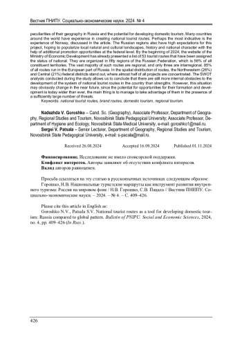 С 2020 г. в стране проявился долгосрочный тренд развития внутреннего туризма, сопровождающийся системой государственных мер, направленных на формирование туристского потенциала внутри страны. Рост числа внутренних туристов и продвижение межрегиональных туристских маршрутов стали одной из национальных задач развития туризма в России. Прогресс отрасли могут обеспечить национальные туристские маршруты, разработанные с учетом существующих потребительских трендов. В силу молодости данного явления отечественной туристской отрасли возникает естественное желание глубже изучить его сущность и возможности реализации с их участием туристского потенциала страны. Это определило цель исследования - изучить сущностные черты национальных туристских маршрутов, особенности их географии в России и потенциальные возможности в развитии внутреннего туризма. Опыт создания национальных туристских маршрутов имеется во многих странах мира. Пожалуй, наиболее показателен опыт Норвегии, рассмотренный в статье. В российских регионах с этим проектом также связывают большие ожидания, надеясь с помощью дополнительных возможностей по продвижению на федеральном уровне популяризировать местные природные и культурные ландшафты, историю и национальный колорит. К началу 2024 г. на сайте Министерства экономического развития представлен список уже из 53 туристских маршрутов, которым присвоен статус национальных. Они организованы в полусотне субъектов Российской Федерации, что составляет 56 % всех регионов страны. Подавляющее большинство таких маршрутов являются региональными и лишь три - межрегиональными. В европейской части России пролегает 85 % всех маршрутов. В пространственной картине их распределения выделяются Северо-Западный (26 %) и Центральный (21 %) федеральные округа, в которых концентрируется почти половина всех проектов. Проведенный в ходе исследования SWOT-анализ позволяет сделать вывод - внутренних препятствий для развития системы национальных турмаршрутов в стране пока больше, чем сильных сторон. Однако подобное положение, очевидно, может измениться в скором будущем, поскольку потенциал возможностей для их формирования и развития сегодня широк как никогда, главное успеть ими воспользоваться при наличии достаточно большого числа угроз.