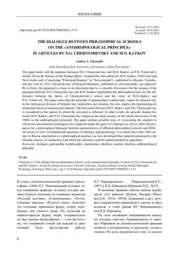 Проанализирована полемика между Н. Г. Чернышевским и М. Н. Катковым о статье П. Д. Юркевича «Из науки о человеческом духе». В частности, анализируются статьи М. Н. Каткова «Старые боги и новые боги» и «По поводу “полемических красот” в “Современнике”», опубликованные в «Русском вестнике», и работа Н. Г. Чернышевского «Полемические красоты», опубликованная в «Современнике». Отмечено, что по форме спор похож скорее на перебранку, чем на научную дискуссию, но содержательно в ходе спора Н. Г. Чернышевского и М. Н. Каткова были выражены философские основания разногласий между теорией школы Чернышевского и взглядами М. Н. Каткова и П. Д. Юркевича. Указывается, что принцип партийности философии не сводится к разделению мыслителей только на материалистов и идеалистов в онтологии, но также гласит о гносеологическом различии между монизмом и дуализмом. Дискуссия между М. Н. Катковым и Н. Г. Чернышевским рассматривается как особенное, в котором отражается всеобщее. Другими словами, в эпизодическом споре между мыслителями выражена основная суть всей дискуссии 1860-х гг. об антропологическом принципе. Начертаны возможные пути преодоления ситуации, в которой под видом диалога ведется два несвязанных друг с другом монолога. Намечены перспективы налаживания философского диалога между представителями разных философских школ, разных точек зрения на фундаментальные вопросы онтологии и теории познания. Отмечено, что в XIX в. в России материализм как философское учение был менее разработан, чем идеализм, представленный немецкими классиками, в связи с чем могла возникать недооценка этого учения оппонентами.