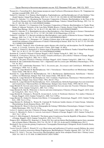 3. Генкал C.И., Габышев В.А. Каталог диатомовых водорослей водоемов Усть-Ленского заповедника и сопредельных территорий. Новосибирск: Наука, 2023. 128 c.
