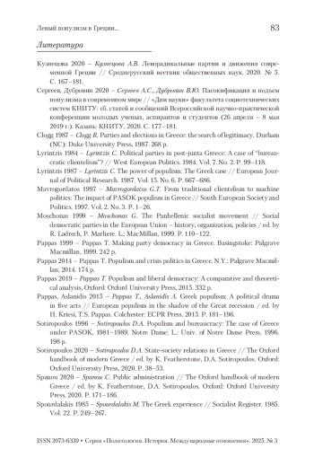 1. Кузнецова 2020 - Кузнецова А.В. Леворадикальные партии и движения современной Греции // Среднерусский вестник общественных наук. 2020. № 5. С. 167-181.