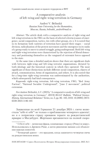 Статья посвящена сравнительному анализу правого и левого терроризма в ФРГ на основе выделенных критериев (причины возникновения, социальный состав, тактика, связи с другими группами и т. д.). Отмечается, что в своем становлении обе разновидности терроризма прошли три стадии – общественный раскол, радикализация протестного движения и появление в ее рядах группы, готовой перейти к вооруженной борьбе, уход в подполье. И для левого, и для правого терроризма было характерно отрицание либеральной демократии и позиционирования себя в качестве авангарда экстремистских сил, выступающих против государства. Вместе с тем детальный анализ показывает, что между правыми и левыми террористическими организациями есть существенные отличия, продиктованные как идеологией, так и историческим контекстом, в котором они действовали. К наиболее существенным из них следует отнести различный социальный состав, объекты атаки, коммуникацию, формы организации и др. Также отмечается, что правый терроризм на протяжении долгого времени был недооценен властями, что имело в будущем фатальные последствия.