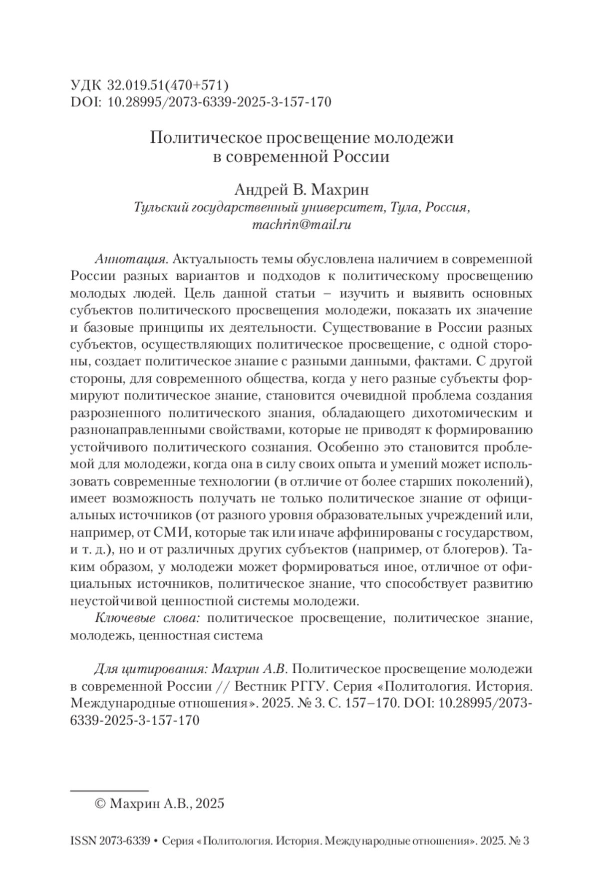 Актуальность темы обусловлена наличием в современной России разных вариантов и подходов к политическому просвещению молодых людей.