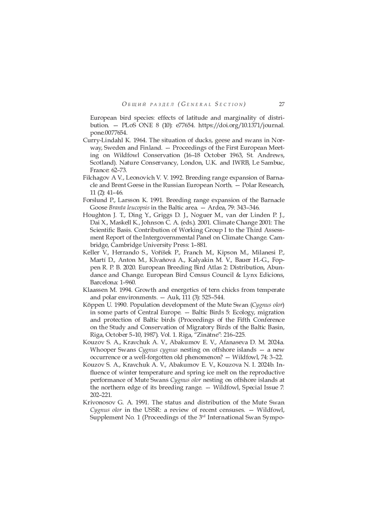 72. Kouzov S. A., Kravchuk A. V., Abakumov E. V., Afanaseva D. M. 2024a. Whooper Swans Cygnus cygnus nesting on offshore islands - a new occurrence or a well-forgotten old phenomenon? - Wildfowl, 74: 3-22.