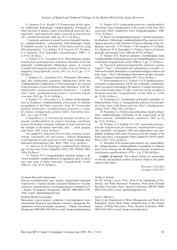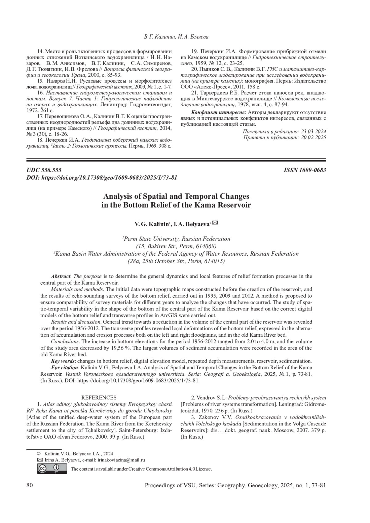 КАЛИНИН В. Г., БЕЛЯЕВА И. А. АНАЛИЗ ПРОСТРАНСТВЕННО-ВРЕМЕННЫХ ИЗМЕНЕНИЙ РЕЛЬЕФА ДНА КАМСКОГО ВОДОХРАНИЛИЩА // ВЕСТНИК ВОРОНЕЖСКОГО ГОСУДАРСТВЕННОГО УНИВЕРСИТЕТА. СЕРИЯ: ГЕОГРАФИЯ. ГЕОЭКОЛОГИЯ. 2025. № 1