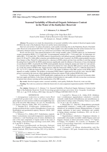 Цель - изучение особенностей сезонной изменчивости содержания растворенных органических веществ (РОВ) в воде Куйбышевского водохранилища и факторов её определяющих. Материалы и методы. Для достижения цели использованы данные мониторинга качества воды на Приплотинном плесе Куйбышевского водохранилища в период 2018-2022 годы. Отбор проб воды осуществлялся ежемесячно с поверхностного горизонта (0,5 м). Лабораторный химический анализ воды проводился в соответствии с действующими нормативными документами. Результаты и обсуждение. Внутригодовые колебания средних месячных значений содержания РОВ составляют: для биохимического потребления кислорода (БПК5) 1,5-2,2 мгО2/дм3, для перманганатной окисляемости (ПО) - 7,0-8,6 мгО2/дм3, для бихроматной окисляемости (БО) - 23-28 мгО2/дм3. Содержание РОВ характеризуется хорошо выраженной сезонной изменчивостью и включает четыре периода (I, II, III и IV), которые отличаются продолжительностью и разнонаправленностью трендов. В период I содержание РОВ постепенно увеличивается с января по май. Период II характеризуется уменьшением содержания РОВ и продолжается с середины мая до середины июня во время весеннего половодья. В период III содержание РОВ существенно увеличивается под воздействием процесса массового развития цианобактерий (МРЦ). В период IV содержание РОВ плавно уменьшается во время осенней и зимней межени. В сезонном разрезе наибольшее содержание РОВ наблюдается в летнюю межень, когда активно протекает процесс МРЦ. В результате содержание РОВ в июле - августе увеличивается в рамках БПК5 на 20-25 %, в рамках ПО - на 13-15 %, в рамках БО - на 4-6 %. Степень влияния процесса МРЦ на содержание РОВ зависит от погодных условий. Проблема роста содержания РОВ обостряется в жаркие и маловодные годы, когда на водохранилище активизируется процесс МРЦ, что существенно увеличивает содержание в воде легко окисляемых РОВ. Выводы. Высокое содержание РОВ существенно затрудняет использование Куйбышевского водохранилища для хозяйственно-питьевого водоснабжения и рыбного хозяйства. В перспективе проблема ухудшения качества воды будет только обостряться из-за роста биогенной нагрузки, потепления климата и активизации процесса МРЦ.