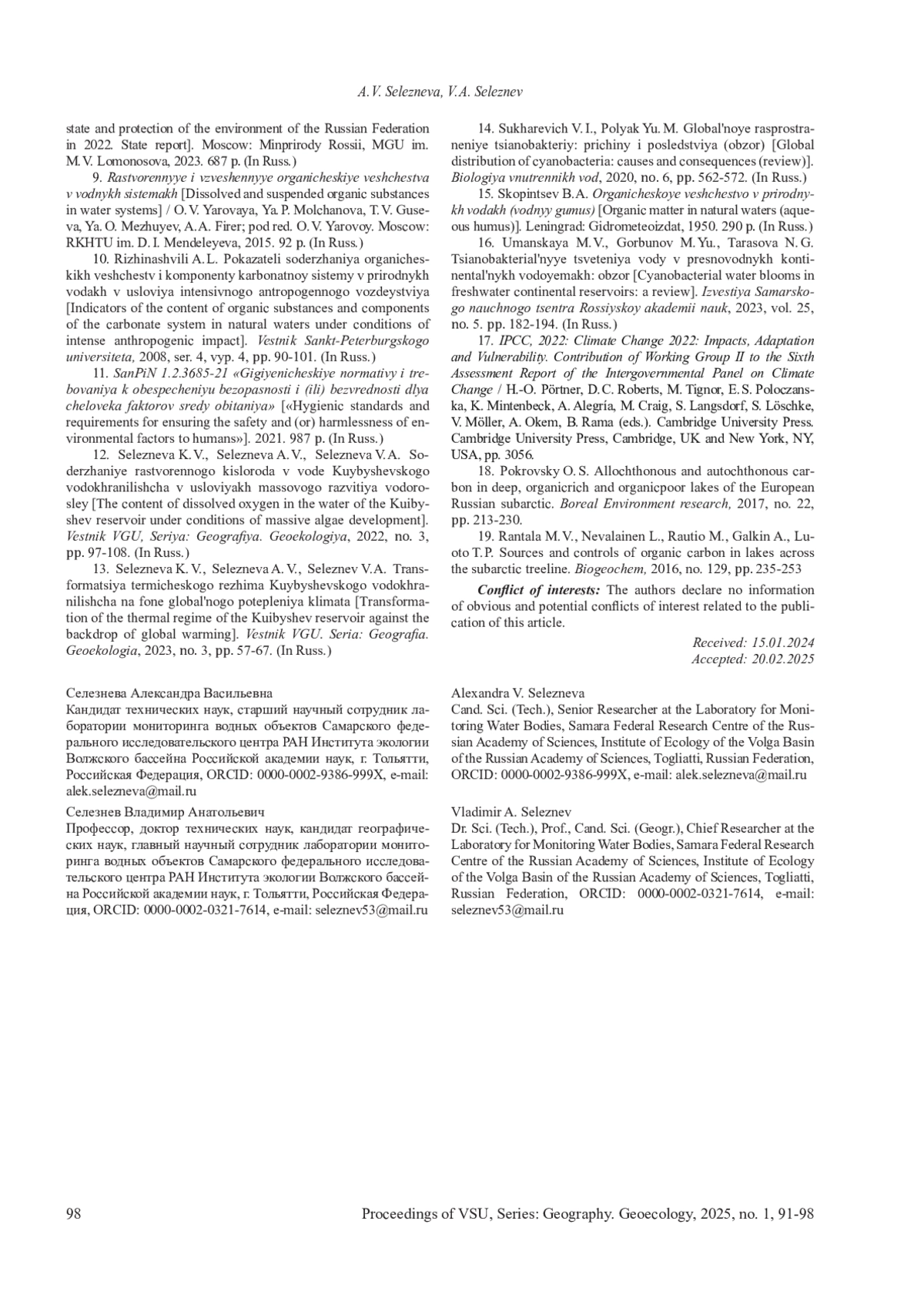 12. Селезнева К. В., Селезнева А. В., Селезнева В.А. Содержание растворенного кислорода в воде Куйбышевского водохранилища в условиях массового развития водорослей // Вестник Воронежского государственного университета. Серия: География. Геоэкология, 2022, № 3, с. 97-108. EDN: UNFXRF