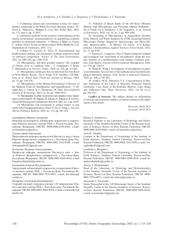 2. Есюкова Е. Е., Чубаренко И. П. Микропластик в водной толще, донных осадках и песках пляжей юго-восточной части Балтийского моря: концентрации, распределение частиц по размерам и формам // Региональная экология, 2019, № 2 (56), с. 16-29. EDN: IGHCPK