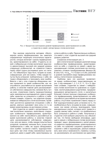 В представленном исследовании проведен сопоставительный анализ особенностей перфекционизма, ориентированного на себя, у студентов из семей с либеральным и авторитарным стилями семейного воспитания. Специфика исследования состоит в том, что в нем наряду с авторитарным изучался либеральный стиль семейного воспитания, которому в литературе уделено мало внимания в силу недостаточной его распространенности в российских семьях по сравнению с авторитарным и демократическим стилями. В результате авторами сделан вывод о том, что имеются статистически подтвержденные различия между показателями перфекционизма, ориентированного на себя, в выборках студентов из семей с либеральным и авторитарным стилями воспитания. Две выборки студентов отличаются по следующим характеристикам: воспитанные в авторитарных семьях не ставят перед собой трудно достижимые цели, не стремятся к максимальному приложению усилий, не стремятся быть совершенными, в то время как воспитанные в либеральных семьях студенты при постановке целей и стремлении к успеху демонстрируют адекватность в отношении и себя, и других, прилагая максимум усилий, не действуют в ущерб себе. Выявленные особенности студентов могут и должны учитываться при реализации индивидуального подхода к ним как в учебной, так и воспитательной работе.