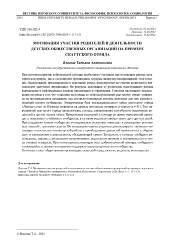 При изучении практик добровольной помощи необходимо учитывать как мотивацию разных категорий волонтеров, так и особенности организаций, которые являются бенефициарами этой помощи. Исследование, представленное в настоящей статье, фокусируется на участии родителей в деятельности скаутской организации. На ресурсы, исходящие от родителей, рассчитывают разные формальные и неформальные детские организации и учреждения. Гипотеза настоящего исследования состояла в том, что установка на помощь со стороны родителей скаутскому отряду опирается на интеграционное замыкание, под которым понимается система значимых для них взаимоотношений внутри сообщества. Эмпирическая база исследовательского кейса скаутского отряда «Лесные коты» из Ижевска опирается на данные групповых интервью и опроса (n = 91). Тип мероприятий скаутского отряда (приключения, походы, соревнования) способствует вовлечению родителей и других членов семьи. Привлечение родителей к помощи во время мероприятий приводит к появлению устойчивого сообщества, в котором родители хорошо знают друг друга и детей. При поддержке членов сообщества потенциальные волонтеры переходят к проведению регулярных занятий с группами скаутов. По материалам опроса, родители демонстрируют типичную мотивацию относительно волонтерской работы с преобладанием ценностей причастности к общему делу и стремлением к деятельности, объединяющей семью. Трудности, о которых сообщают респонденты, связаны с ресурсными ограничениями: недостатком времени и неуверенностью в своих умениях и навыках. При этом родители, имеющие опыт добровольческой помощи, сообщили о сложившейся установке на взаимную поддержку внутри родительского сообщества.
