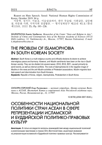 Южная Корея является многоконфессиональной страной и официально заявляет о стремлении к достижению межрелигиозного мира и гармонии. Однако в южнокорейском обществе отмечается рост антимусульманских настроений. Их можно разбить на несколько волн: 2016, 2018, 2021 годы, обусловленные, прежде всего, событиями в мире, а также внутренними конфликтами. Корни исламофобии кроются в негативном образе мусульман в новостной повестке и антимусульманской деятельности протестантских объединений.