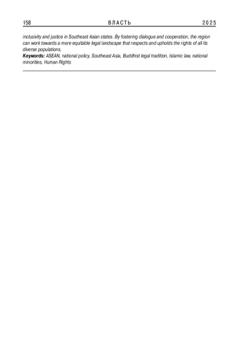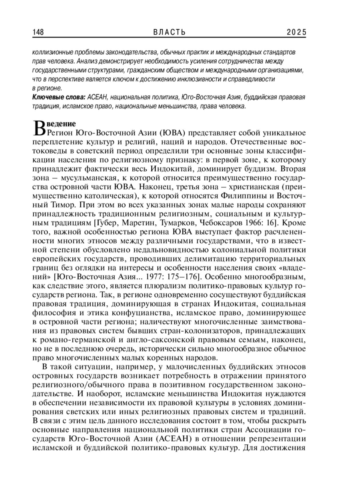 В статье исследуются вопросы взаимодействия между национальной политикой и религиозными практиками в странах Юго-Восточной Азии, акцентируя внимание на репрезентации исламской и буддийской политико-правовых культур. Рассматриваются коллизионные проблемы законодательства, обычных практик и международных стандартов прав человека. Анализ демонстрирует необходимость усиления сотрудничества между государственными структурами, гражданским обществом и международными организациями, что в перспективе является ключом к достижению инклюзивности и справедливости в регионе.