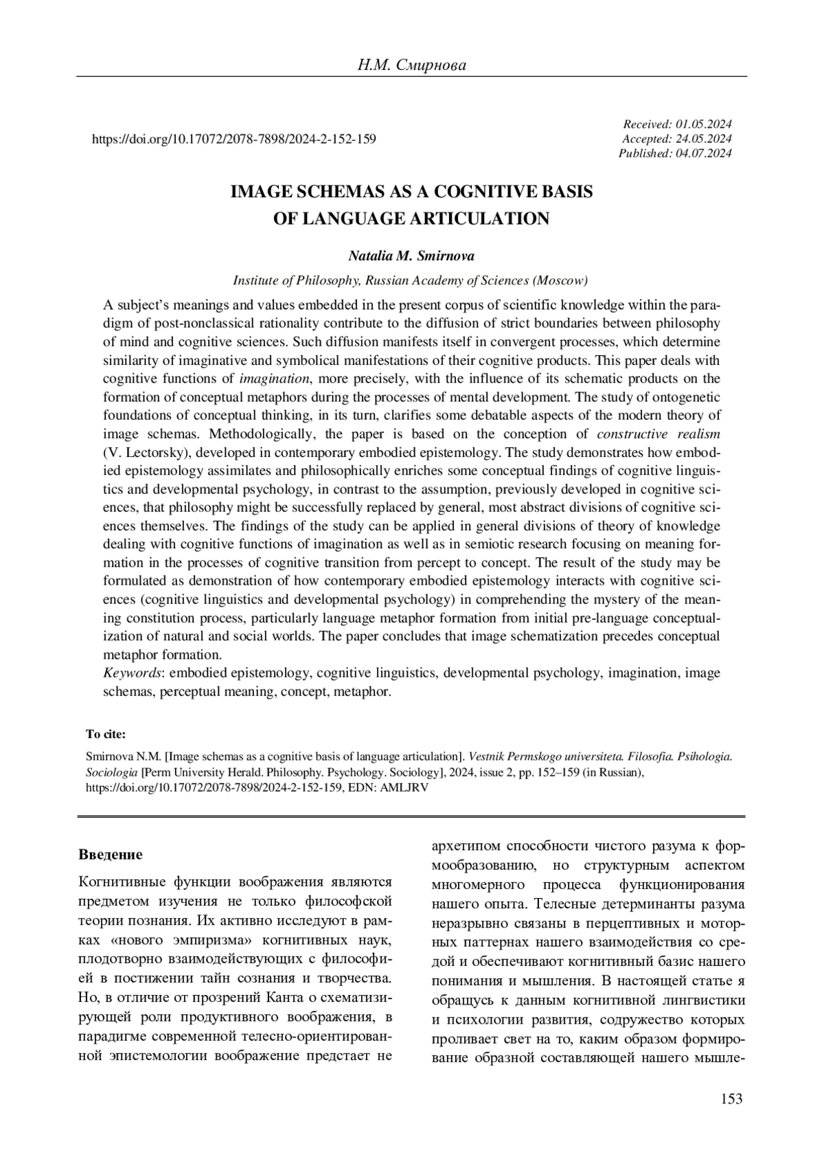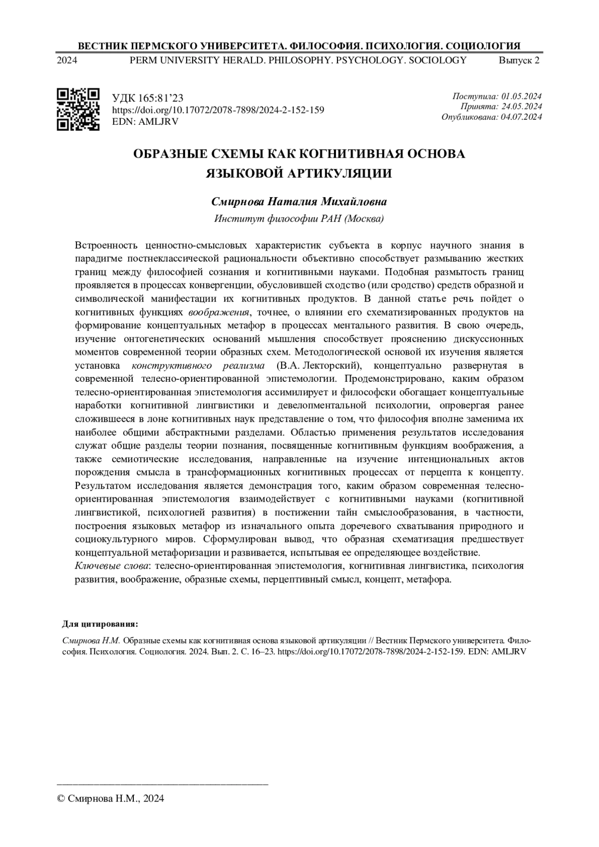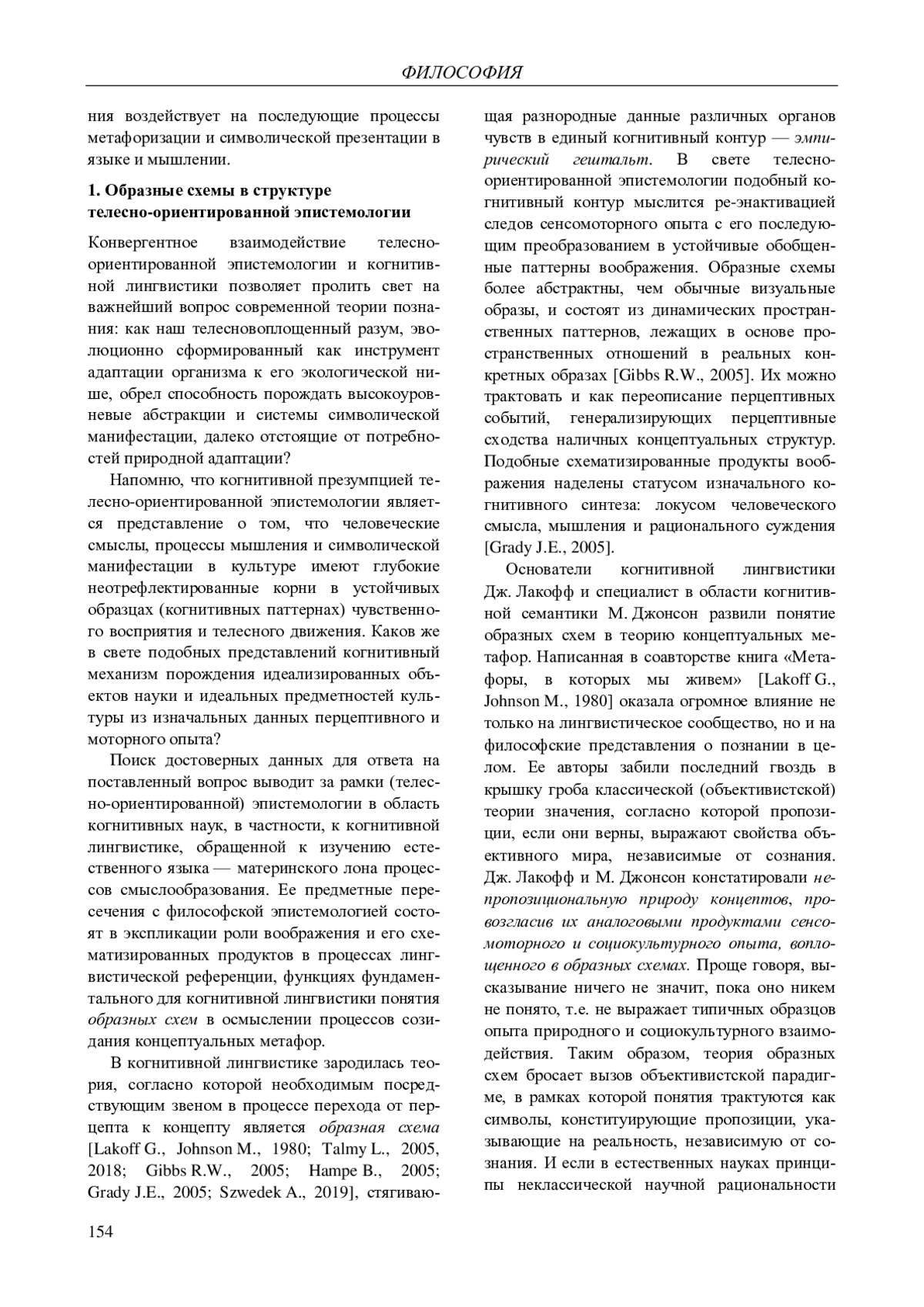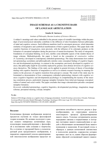 Встроенность ценностно-смысловых характеристик субъекта в корпус научного знания в парадигме постнеклассической рациональности объективно способствует размыванию жестких границ между философией сознания и когнитивными науками. Подобная размытость границ проявляется в процессах конвергенции, обусловившей сходство (или сродство) средств образной и символической манифестации их когнитивных продуктов. В данной статье речь пойдет о когнитивных функциях воображения, точнее, о влиянии его схематизированных продуктов на формирование концептуальных метафор в процессах ментального развития. В свою очередь, изучение онтогенетических оснований мышления способствует прояснению дискуссионных моментов современной теории образных схем. Методологической основой их изучения является установка конструктивного реализма (В. А. Лекторский), концептуально развернутая в современной телесно-ориентированной эпистемологии. Продемонстрировано, каким образом телесно-ориентированная эпистемология ассимилирует и философски обогащает концептуальные наработки когнитивной лингвистики и девелопментальной психологии, опровергая ранее сложившееся в лоне когнитивных наук представление о том, что философия вполне заменима их наиболее общими абстрактными разделами. Областью применения результатов исследования служат общие разделы теории познания, посвященные когнитивным функциям воображения, а также семиотические исследования, направленные на изучение интенциональных актов порождения смысла в трансформационных когнитивных процессах от перцепта к концепту. Результатом исследования является демонстрация того, каким образом современная телесно-ориентированная эпистемология взаимодействует с когнитивными науками (когнитивной лингвистикой, психологией развития) в постижении тайн смыслообразования, в частности, построения языковых метафор из изначального опыта доречевого схватывания природного и социокультурного миров. Сформулирован вывод, что образная схематизация предшествует концептуальной метафоризации и развивается, испытывая ее определяющее воздействие.
