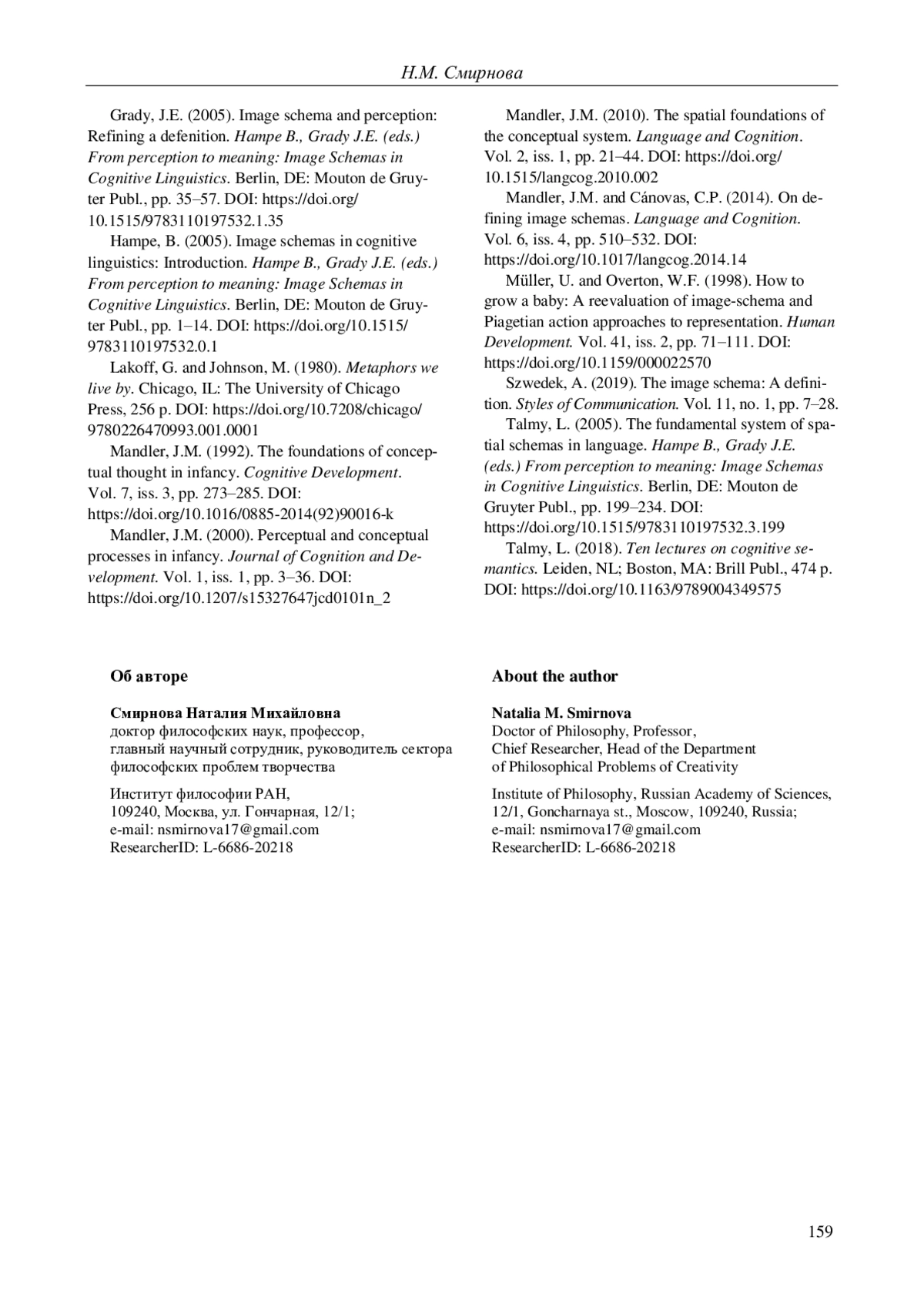 2. Grady, J.E. (2005). Image schema and perception: Refining a defenition. Hampe B., Grady J.E. (eds.) From perception to meaning: Image Schemas in Cognitive Linguistics. Berlin, DE: Mouton de Gruyter Publ., pp. 35-57. DOI: 10.1515/9783110197532.1.35