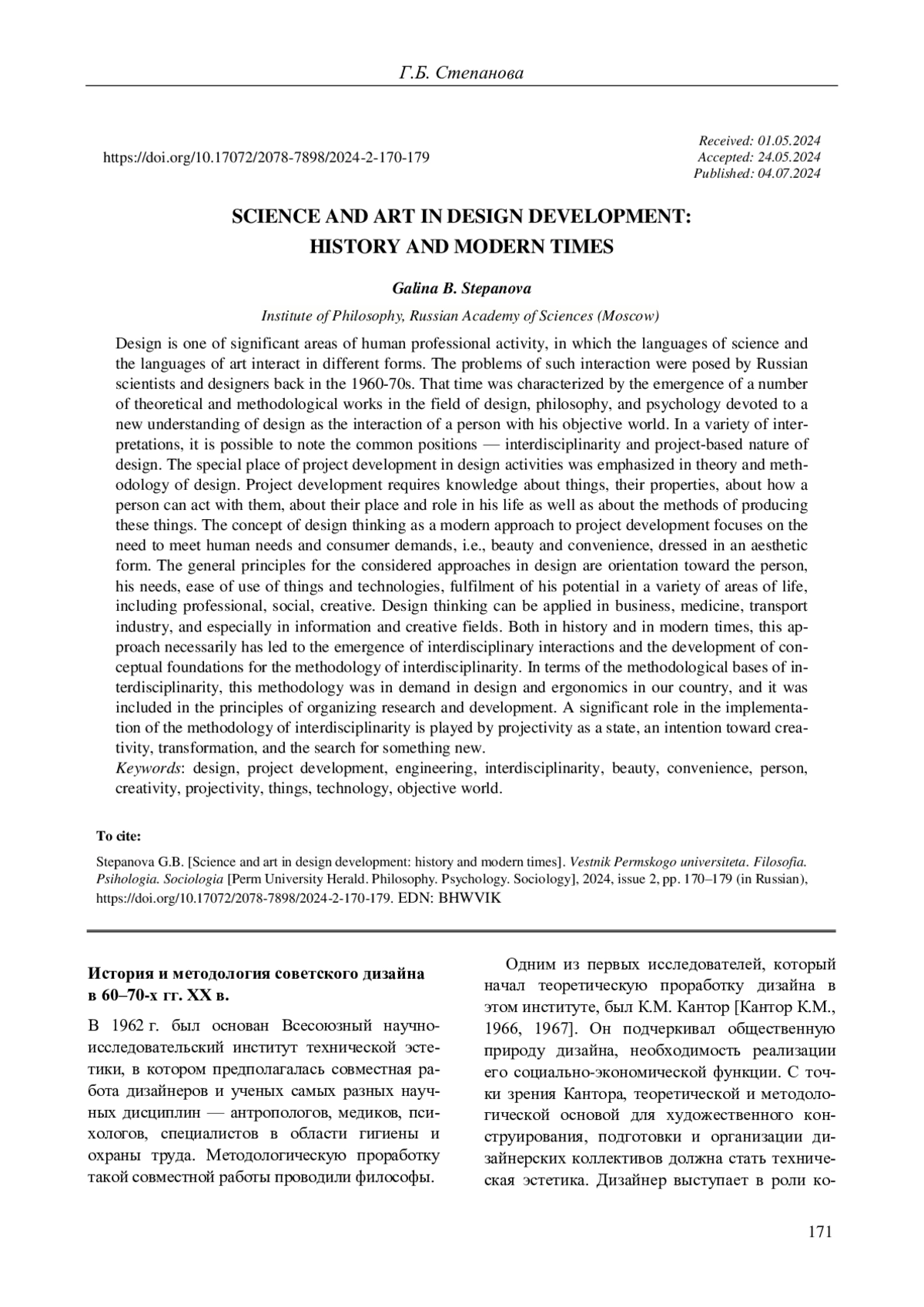 Дизайн является одной из значимых областей профессиональной деятельности человека, в которой в разных формах взаимодействуют языки науки и языки искусства. Проблемы такого взаимодействия ставились отечественными учеными и дизайнерами еще в 60-70-х гг. XX в. Это время характеризуется появлением целого ряда теоретических и методологических работ в области художественного проектирования, философии и психологии, посвященных новому пониманию дизайна как взаимодействия человека с его предметным миром. В самых разных трактовках отмечались общие позиции - это междисциплинарность и проектность дизайна. При разработках теории и методологии дизайна подчеркивалось особое место проектирования в художественно-конструкторской деятельности. Проектирование требует как знаний о вещах, их свойствах, способах действий с ними человека, месте и роли в его жизнедеятельности, так и о способах производства этих вещей. Концепция дизайн-мышления как современный подход к проектированию делает акцент на удовлетворении человеческих потребностей и потребительских запросов - это красота и удобство, облаченные в эстетичную форму. Общими принципами для рассматриваемых подходов в дизайне является ориентация на человека, его потребности, удобство пользования вещами, технологиями, реализацию его способностей и возможностей в самых разных областях жизнедеятельности, в том числе профессиональной, социальной, творческой. Дизайн-мышление может применяется в бизнесе, медицине, транспортной отрасли, и особенно в информационной и творческой области. Как в прошлом, так и в современности такой подход с необходимостью приводит к появлению междисциплинарных взаимодействий, разработке концептуальных основ методологии междисциплинарности. Имеет смысл отметить, что с точки зрения методологических оснований междисциплинарности в отечественном дизайне и эргономике эта методология была с необходимостью востребована, отрефлексирована и включена в принципы организации исследований и разработок. Существенную роль в реализации методологии междисциплинарности несет в себе проективность как состояние, интенция на творчество, преобразования, поиск нового.