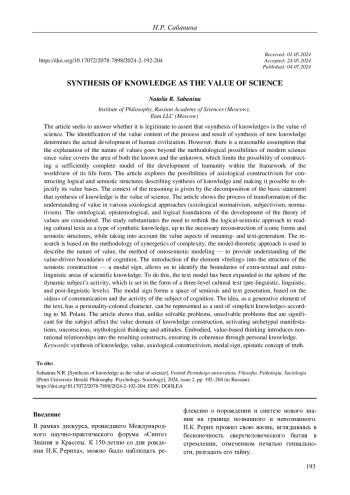В статье мы стремимся ответить на вопрос: правомерно ли утверждать, что «синтез знания» является ценностью науки. Выявление ценностного содержания процесса и результата синтеза нового знания определяет актуальное развитие человеческой цивилизации. Однако существует обоснованное предположение, что объяснение природы ценностей выходит за рамки методологических возможностей современной науки, т. к. ценность охватывает одновременно область познанного и непознанного, что ограничивает возможность конструирования достаточно полной модели развития человечества рамками картины мира своей формы жизни. В статье исследуются возможности аксиологического конструктивизма для построения логико-семиотических структур описания синтеза знания, позволяющие произвести объективацию его ценностных оснований. Контекст рассуждения задан декомпозицией базового утверждения о том, что синтез знания является ценностью науки. Показан процесс трансформации понимания ценности в различных аксиологических подходах (аксиологический нормативизм, субъективизм, нормативизм). Рассмотрены онтологические, гносеологические, логические основания развития теории ценностей. Обосновывается необходимость переосмысления логико-семиотического подхода к прочтению текстов культуры как вида синтетического знания, вплоть до необходимой реконструкции знаковых форм и семиотических конструкций с учетом ценностных аспектов смысло- и текстопорождения. Исследование основывается на методологии синергетики сложностности, использован теоретико-модельный подход с целью описания природы ценности, а также метод онтосемиотического моделирования для понимания ценностно обусловленных границ познания. Введение элемента «чувство» в структуру семиотического построения модального знака позволяет обозначить границы внетекстовых и внеязыковых областей научного знания. Для этого модель текста расширена до среды деятельности динамического субъекта, которая задана в виде трехуровневого текста культуры (доязыковой, языковой и постъязыковой уровни). Модальный знак образует пространство семиозиса и текстопорождения на основе «замысла» коммуникации и деятельности субъекта познания. Замысел как порождающий элемент текста носит личностно окрашенный характер, может быть представлен как единица «неявного знания» (по М. Полани). Показано, что в отличие от проблем разрешимых, неразрешимые проблемы значимы для субъекта, затрагивают ценностную область построения знания, активируя архетипические проявления, бессознательное, мифологическое мышление и установки. Отелесненное, ценностнозначное мышление вводит внерациональные отношения в полученные конструкты, обеспечивая его связность через личностное знание.