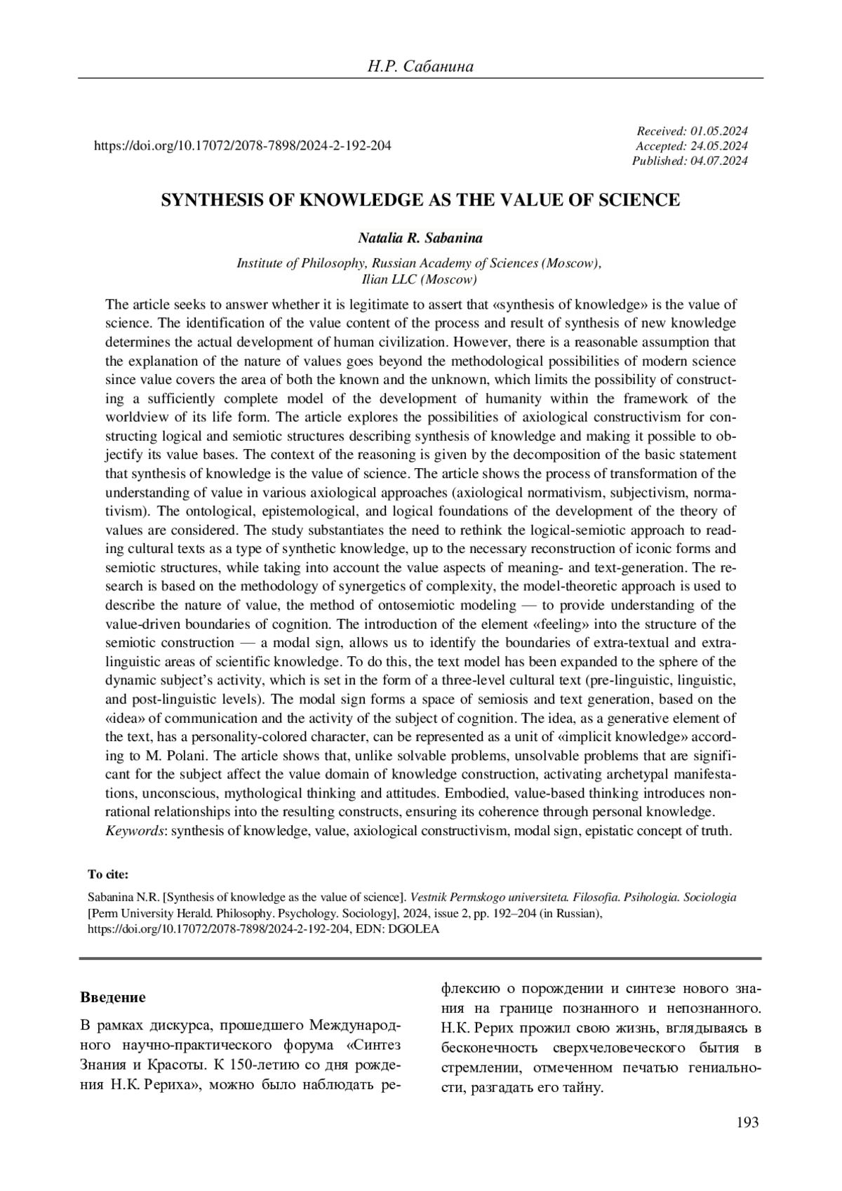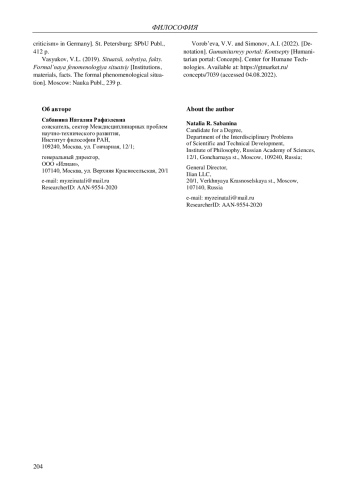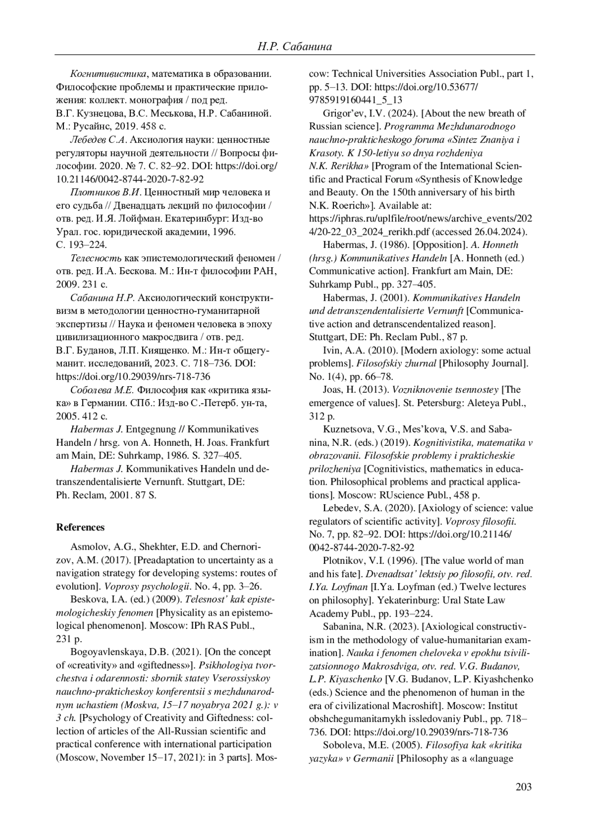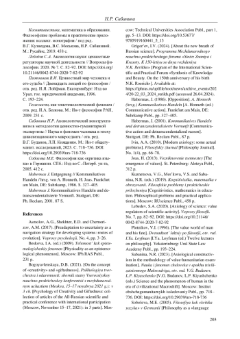 12. Сабанина Н.Р. Аксиологический конструктивизм в методологии ценностно-гуманитарной экспертизы // Наука и феномен человека в эпоху цивилизационного макросдвига / отв. ред. В.Г. Буданов, Л.П. Киященко. М.: Ин-т общегуманит. исследований, 2023. С. 718-736. DOI: 10.29039/nrs-718-736 EDN: TMIVIM