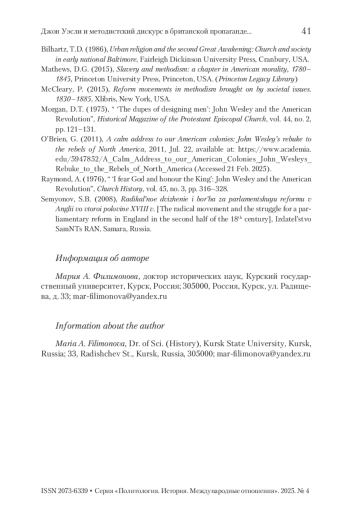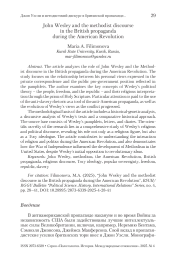 Методологическая основа статьи включает историко-генетический анализ, дискурсивный анализ текстов Уэсли и сравнительно-исторический подход. Источниковую базу составляют памфлеты, письма и дневники Уэсли. Научная новизна исследования заключается в комплексном изучении религиозного и политического дискурса Уэсли, раскрытии его роли не только как религиозного деятеля, но и как идеолога торийского толка. Статья вносит вклад в понимание взаимодействия религии и политики в эпоху Американской революции, а также демонстрирует, как Война за независимость повлияла на развитие методизма в США, несмотря на изначальную оппозицию Уэсли революционным идеям.