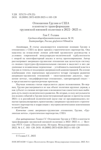 В статье анализируется изменение позиции Грузии в отношениях с США на фоне кризиса стратегического партнерства. Она нацелена на осмысление логики действий грузинского руководства в условиях современной международно-политической турбулентности с опорой на многофакторный анализ и метод прогнозирования. Автор рассматривает американо-грузинские отношения как целостную систему со своими структурно-функциональными связями и выделяет в них две значимые и независимые переменные – устойчивость нынешней власти в Грузии и степень ее поддержки американской администрацией. На основе комбинации этих переменных предлагается четыре сценария развития американо-грузинских отношений – «восстановление диалога», «крушение мечты», «индифферентные отношения», «авторитарный откат» – и представляются краткосрочные прогнозы.