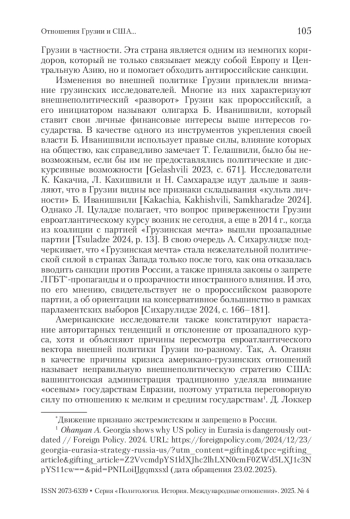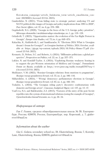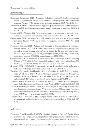 5. Fukuyama, Evgenidze 2025 - Fukuyama F., Evgenidze N. Russia is winning in Georgia // Foreign Affairs. 2025. Apr. 6. URL: https://www.foreignaffairs.com/georgia/russia-united-states-winning-georgia?check_logged_in=1&utm_medium=promo_email&utm_source=lo_flows&utm_campaign=article_link&utm_term=article_email&utm_content=20250302 (дата обращения 23.02.2025).