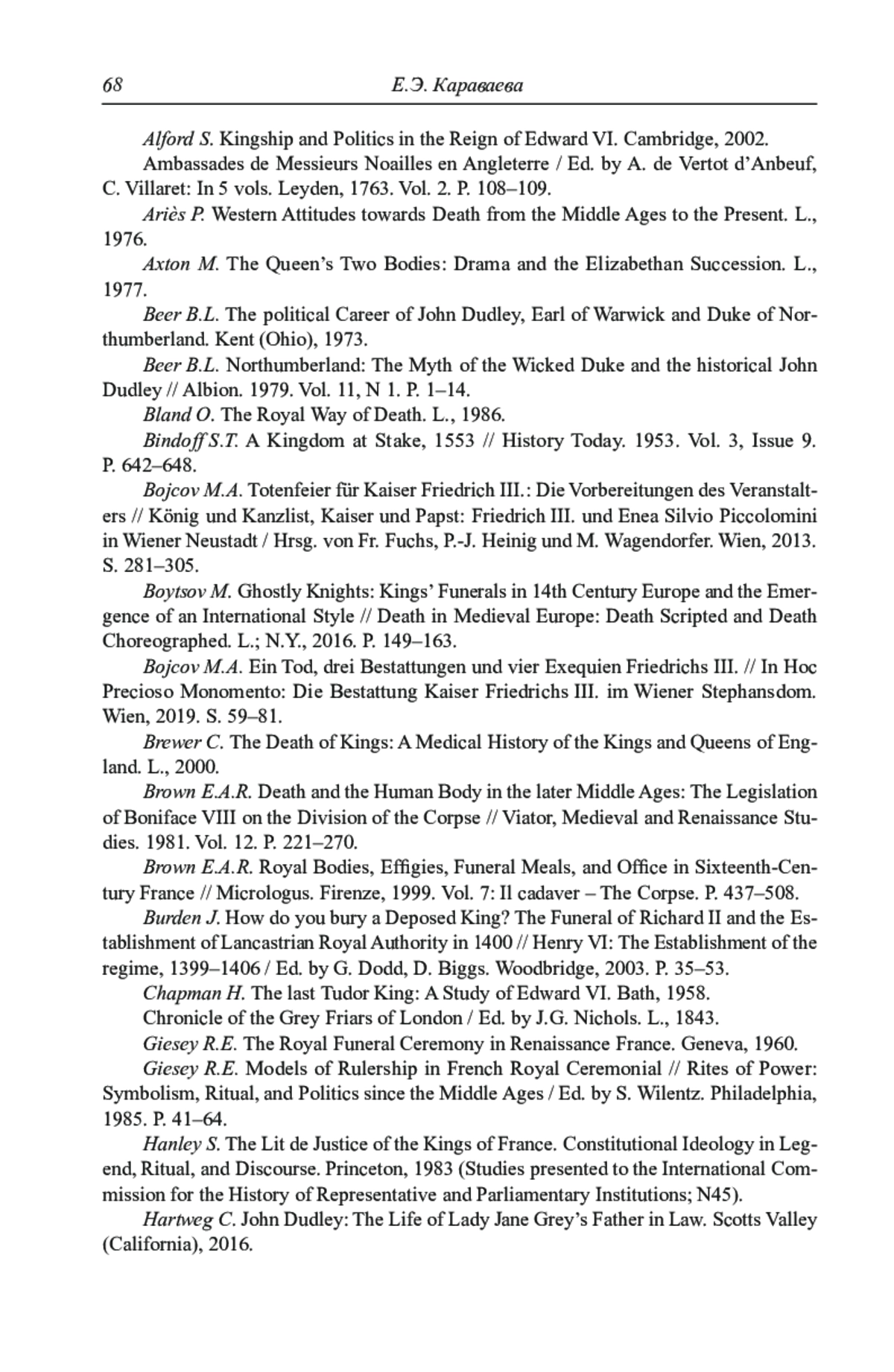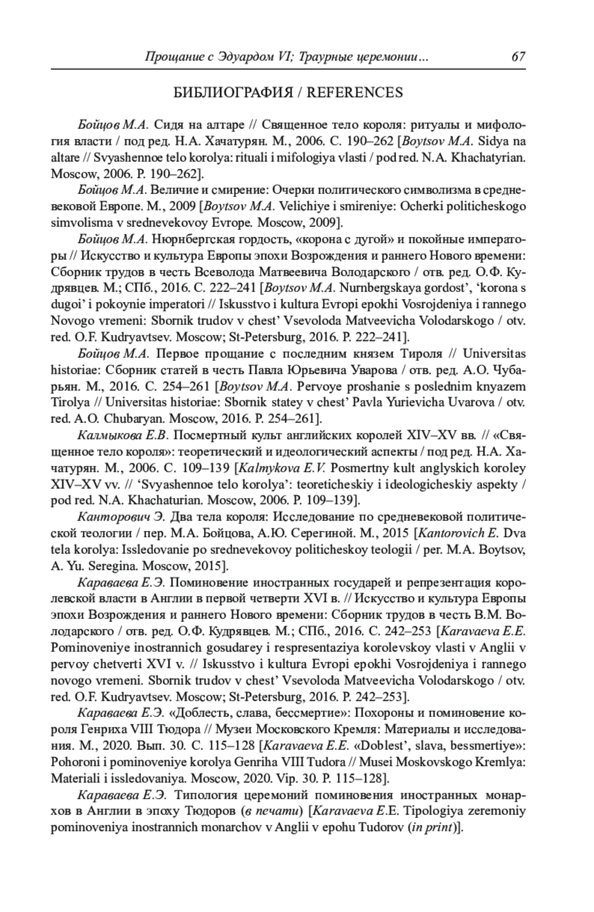 7. Караваева Е.Э. Поминовение иностранных государей и репрезентация королевской власти в Англии в первой четверти XVI в. // Искусство и культура Европы эпохи Возрождения и раннего Нового времени: Сборник трудов в честь В.М. Володарского / отв. ред. О.Ф. Кудрявцев. М.; СПб., 2016. С. 242-253.