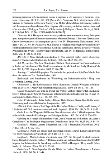 2. Лурье З.А., Полякова М.А. “Наставления визитаторов проповедникам Саксонского курфюршества” Филиппа Меланхтона: вступительная статья и комментированный перевод разделов “О ежедневных делах в церкви” и “О школах” // Религия. Церковь. Общество. 2019. С. 359-360. DOI: 10.24411/2308-0698-2019-00017 EDN: UEIWBF